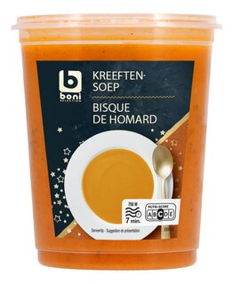 Eau, carottes, CELERI-rave, oignons, concentré [roux (farine deBLE, graisse de palme), purée de tomates, amidon modifié, sucre, sel, exhausteurs de goût (E621, E627, E631), graisse de palme,oignons, arômes (contient du CELERI), maltodextrine, jus de betterave rouge, extrait de levure, épices (poivre, graines de CELERI),basilic, amidon, dextrose], 2 % HOMARD, crème [CRÈME, amidon modifié, stabilisants (E407, E331, E466), émulsifiant (E471)], fondde crustacés [sel, farine de BLE, amidon, CREVETTES en poudre, sucre, arômes (dont HOMARD), tomates, huile de tournesol,maltodextrine, POISSON en poudre, oignons, extrait de levure, sucre brûlé, jus de betterave en poudre, poivre blanc, extrait de vinblanc], pulpe de tomates (tomates, jus de tomate), poireaux, amidon modifié, bouillon de POISSON, poivre blanc.