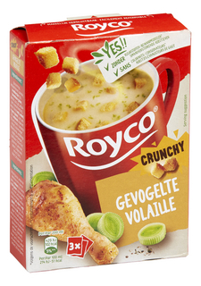Ingrédients: sirop de glucose, amidon de pomme de terre, huile de palme, CROUTONS 8,5% (farine de BLE (GLUTEN), huile de palme, sel, levure, antioxydant: extrait de romarin), arômes (contient LAIT, CELERI et ORGE (GLUTEN)), sel, poireau 2,0%, protéine de LAIT, graisse de poulet 1,1% (antioxydant: extrait de romarin), substitut de sel: chlorure de potassium, épaississant: gomme de xanthane, stabilisants: E340 et E451, extrait de levure, persil, épice, extrait de viande de poulet 0,04%. Contient 2,0% de légumes.