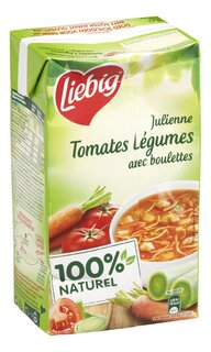 Ingrédients: eau, purée de tomates à base de concentré 20%, oignon, carotte, VERMICELLES cuits 4,7% (farine de BLE (GLUTEN), blanc d’OEUF), poireau, CELERI-RAVE, boulettes 2,5% (viandes de porc et de bœuf, CHAPELURE (farine de BLE(GLUTEN), levure), sel, épices et herbes), amidon de maïs, sel, huile de colza, arômes (contient du céleri), Peut contenir des traces de lait. Contient 43% de légumes.