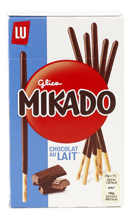 Ingrédients : Farine de BLÉ, sucre, beurre de cacao, pâte de cacao, LAIT écrémé en poudre, lactosérum en poudre (de LAIT), graisses végétales (palme, coprah), BEURRE concentré, sel, émulsifiants (lécithines de SOJA, E476), poudre à lever (E503), levure, arôme.