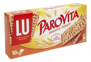 Ingrédients : Farine complète de BLÉ 66 %, farine de BLÉ 14 %, graines de SÉSAME 9,5 %, huile de palme, extrait de malt d'ORGE, son de BLÉ 1,5 %, poudres à lever (carbonates d'ammonium, carbonates de sodium), levure, sel iodé (sel, iodate de potassium), agent de traitement de la farine (DISULFITE de sodium).PEUT CONTENIR ŒUF, LAIT, FRUITS A COQUE.