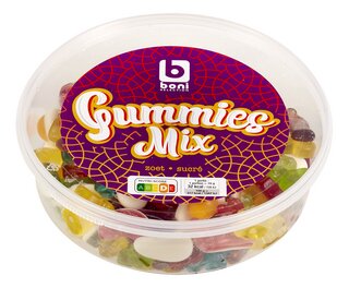 Sirop de glucose, sucre, eau, gélatine de porc, acidifiant (E330), maltodextrine, arômes (citron, orange, fraise, pomme, poire, cola), colorants (E100, E120, E141, E150d, E160e), huiles végétales (palmiste, coco), agents d'enrobage (E901, E903).
