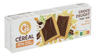Ingrédients: Farine de BLÉ 45,5%, chocolat noir de couverture avec édulcorant 36,3% (pâte de cacao¹, édulcorant: maltitols, beurre de cacao¹, émulsifiant: lécithines [SOJA], arôme naturel de vanille), édulcorant: maltitols, huile de tournesol oléique, fibres de BLÉ, fibres d'AVOINE, LAIT écrémé en poudre, amidon de riz, jaune d'ŒUF en poudre, poudres à lever: carbonates de potassium et carbonates d'ammonium, sel, arôme naturel de vanille, poudre de jus de citron concentré, maltodextrine, ¹Certifié Rainforest Alliance. En savoir plus sur ra.org.PEUT CONTENIR DES TRACES DE FRUITS À COQUE ET DE GRAINES DE SÉSAME.