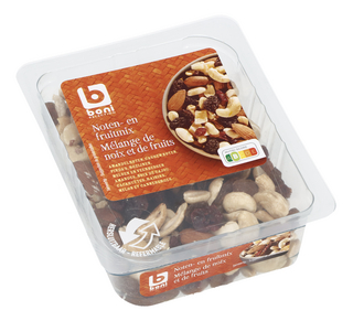 21 % CACAHUÈTES, 20 % AMANDES, 20 % NOIX DE CAJOU, 20 % raisins secs (raisins secs, huile de tournesol), 10 % melon[melon, sucre, correcteur d’acidité (E330), arôme, conservateur (E220,contient des SULFITES)], 9 % canneberges (canneberges, sucre, huile detournesol).