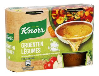 Ingrédients: Eau, sel, carotte¹ 7,5%, graisse de palme, sucre, poireau¹ 5%, extrait de levure, poivron rouge¹ 2,3%, CÉLERI-RAVE¹ 0.9%, gélifiant (gomme xanthane, farine de graines de caroube), arôme, épices (graines de CÉLERI, livèche¹, muscade, poivre), persil¹, sirop de caramel, maltodextrine. ¹issus de l'agriculture durable. Plus d’informations sous: www.knorr.be