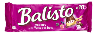 Biscuit aux céréales complètes (36%) et crème goût fruits des bois, le tout enrobé de chocolat au lait (39%). Biscuit aux céréales complètes (36%), crème goût fruits des bois, le tout enrobé de chocolat au lait (39%).