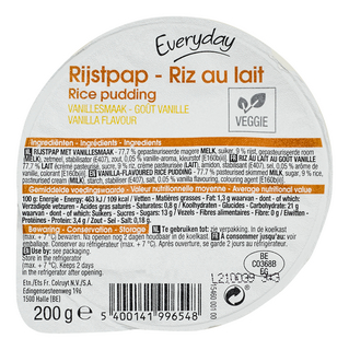 77 % LAIT écrémé, 9 % riz, sucre, protéines de LAIT, huile de coco partiellement hydrogénée, amidon modifié, stabilisant(E407), sel, 0,1 % arôme (vanille), colorant (E160b).
