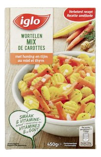 3 portions d'un mélange de carottes, carottes jaunes et d'onions, avec un assaisonement au thym et au miel. Surgelé.