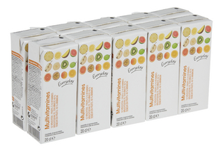 Boisson multifruit partiellement à base de concentrés, avec ajout de vitamines B1, B2, B3, B5, B6, B8, B12, C, E et provitamine A