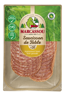 viande de porc, sel, dextrose, maltodextrine, épices, plantes aromatiques, arôme, antioxygène: E301; colorant: E120; conservateur: E250, E252; ferments, fumée. Peut contenir des traces de: lait. 100g de produit préparé à partir de 130g de viande.