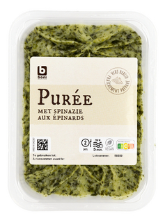 58,9 % pommes de terre,30,4 % épinards, huiles végétales [colza, tournesol, arôme naturel(beurre)], sel, poivre, noix muscade, lécithine de tournesol, stabilisant(E415), conservateur (E223).