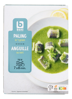 43 % ANGUILLE, eau, 7 % épinards,5 % cerfeuil, 4 % persil, oignons, huile detournesol, 0,9 % vin blanc, amidon modifié,BEURRE, bouillon de poisson [fumet depoisson (extrait de CABILLAUD, extrait deCOLIN), glucose, maltodextrine, sel, huilesvégétales (colza, tournesol), extrait d’oignons,extraits de plantes aromatiques et d’épice],0,6 % jus de citron à base de concentré, sel,ail, 0,5 % oseille, 0,5 % estragon,0,4 % menthe, poivre.