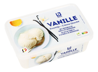 58,6 % LAIT entier, sucre, 17 % crème (LAIT), LAIT écrémé en poudre, 2,8 % jaunes d’ŒUFS, émulsifiant (E471), épaississants (E410, E412), stabilisant (E407), 0,6 % arôme de vanille de Madagascar, 0,03 % graines de vanille de Madagascar.