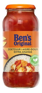 Ingrédients: eau, tomates, sucre, oignon, ananas (9.3%), carotte (8.2%), vinaigre, amidon de maïs modifié, poivron vert, poivron rouge, pousses de bambou, sel, colorant (extrait de paprika), épices.