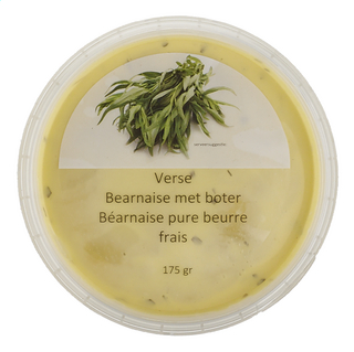 eau, beurre concentré 34 % (LAIT), mousseline (amidon de maïs, amidon de riz, sel, poudre de jaune d'OEUF, LAIT entier en poudre, graisse végétale (noix de coco), LACTOSE, protéine de LAIT, betterave rouge, crème de riz, arôme naturel, curcuma), vinaigre de vin blanc, estragon, échalote, sel marin, poivre noir, feuilles de laurier, thym