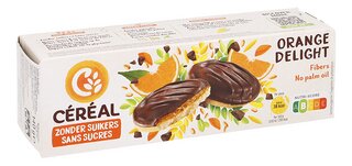 Génoises fourrées 50% à l'orange, nappées chocolat noir, avec édulcorant.