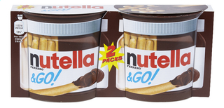 Pâte à tartiner aux noisettes et cacao. Ingrédients : sucre, huile de palme, NOISETTES 13%, LAIT écrémé en poudre 8,7%, cacao maigre 7,4%, émulsifiants : lécithines [SOJA], vanilline. Bâtonnets céréaliers. Ingrédients : farine de FROMENT, huile de palme, sel, extrait de malt d'ORGE 1,3%, levure de bière. Peut contenir SOJA, MOUTARDE et LUPIN.