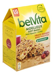 Ingrédients : Céréales 44,1 % [farine de BLÉ 23,7 %, céréales complètes 17,8 % (sarrasin complet concassé 6,9 %, gruau d'AVOINE 6,9 %, flocons d'AVOINE 1 %, farine complète d'épeautre (BLÉ) 1 %, farine complète d'ORGE 1 %, farine complète de BLÉ 1 %), farine de riz 2,5 %, farine de BLÉ malté 0,1 %], sucre, huile de colza, amidon modifié, canneberges séchées confites 6 % (sucre, canneberges 2 %, huile de tournesol), fibres de racine de chicorée, isomaltulose***, humectant (glycérol), raisins de Corinthe 2 %, minéraux (carbonate de calcium, carbonate de magnésium, fer élémentaire), émulsifiant (lécithines de SOJA), jus de groseille concentré 0,3 %, arômes, sel, poudre à lever (carbonates de sodium), gluten de BLÉ, dextrose, amidon. PEUT CONTENIR LAIT.