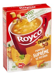 Ingrédients: amidon de pomme de terre, sirop de glucose, CROUTONS 15% (farine de BLE (GLUTEN), huile de palme, sel, levure, antioxydant: extrait de romarin), huile de palme, sucre, sel, BEURRE en poudre, arômes (contient LAIT), potiron 2,2%, carotte, oignon, substitut de sel: chlorure de potassium, poireau, tomate, émulsifiant: E472e, acidifiants: acide citrique et tartrique, stabilisants: E340 et E451, betterave rouge, épice, ail, dextrose, persil, extrait de levure, protéine de LAIT, CELERI. Contient 8,0% de légumes.