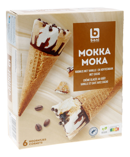 30 % crème glacée et 29 % crème glacée au goût café dans 17 % cornet garni de 15 % sauce au café, de 6 % fantaisie au cacao et de 3 % morceaux de café enrobés de chocolat