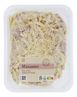 36 % macaronis cuits (eau, semoule de BLÉdur), LAIT, 13 % jambon (viande de porc, sel, dextrose, extrait de légumes, arôme, extrait d’épices et deplantes aromatiques), eau, 10 % emmental (LAIT, ferments lactiques, coagulant, sel), CRÈME, amidonmodifié, BEURRE, 1 % grana padano [LAIT, sel, présure, conservateur (E1105, contient des OEUFS)], sel,plantes aromatiques et épices, farine de BLÉ, stabilisant (E407).
