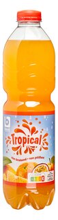 Eau de source, 12 % jus defruits à base de concentrés(6,4 % orange, 5,5 % pomme,0,1 % fruit de la passion, 0,1 %mangue), sucre, arôme, colorant(E160c), stabilisant (E445),acidifiant (E330), antioxydant(E300).