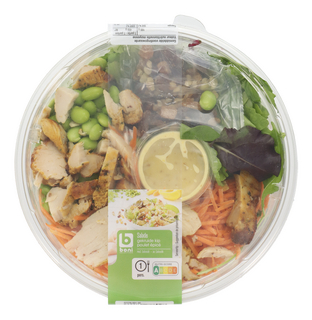 35 % taboulé [mélange de céréales (semoule deBLÉ cuite, flocons de SOJA, flocons d'AVOINE, flocons d'ORGE),5,3 % tomates, 3,5 % concombres, 3,5 % poivrons, 3,5 % échalotes,huile de colza, menthe, persil], 15 % poulet épicé [filet de poulet cuit(filet de poulet, LACTOSE, protéines de SOJA, protéines de LAIT, sel,antioxydant (E331), gélifiant (E407a), stabilisant (E451)), assaisonnement(huile de navette partiellement hydrogénée, émulsifiant (E471), sel, siropde glucose, légumes déshydratés en poudre (oignons, ail), YAOURTen poudre, épices (cumin, paprika, poivre noir, gingembre, cannelle),eau, jus de citron, acidifiant (E330), colorants (E100, E160a), arôme delégumes], 15 % fèves de SOJA, 12,5 % carottes jaunes et oranges,10 % dressing miel-moutarde [eau, huile de colza, MOUTARDE,MOUTARDE en grains, miel, sucre, vinaigre, sel, ail, épaississant (E415),curry (coriandre, curcuma, MOUTARDE, piments, cumin, fenugrec,poivre noir, ail, sel, fenouil, graines de pavot), poivre], 7,5 % jeunespousses (salade verte, blettes à cardes rouges, salade rouge, roquette),5 % mélange de noix et fruits déshydratés [raisins secs (raisins secs,huile de graines de coton et/ou de tournesol), NOIX hachées, abricotsdéshydratés (abricots, farine de riz, conservateur (E220, contient desSULFITES))].