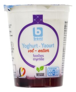 Ingrédients: 80 % yaourt entier (LAIT), sucre, 7 % myrtilles, eau, amidon modifié, sirop de glucose-fructose, épaississants (E440, E412), correcteurs d’acidité (E330, E331, E333), concentrés (carottes, aronia, raisins), arôme, conservateur (E202).