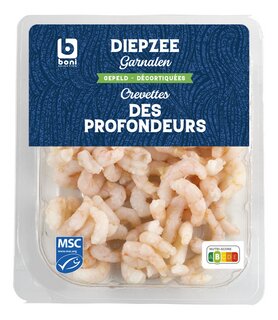 Ingrédients: 97 % crevette nordique (CRUSTACÉ) [Pandalus borealis, pêchée au chalut dans l’Atlantique Nord-Ouest (FAO 21)], sel, correcteurs d’acidité (E260, E270).