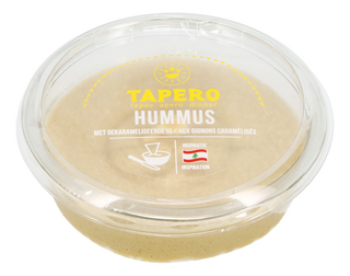 Ingrédients: 42.5% pois chiches, eau, huile de colza, 12.3% pâte de SÉSAME, 9.3%oignons rouges caramélisés(oignon rouge, cassonade, vinaigre de vin rouge,cannelle,dou de girofle),oignon, sel, poudre d’ail, acidifiant: acide citrique; épices, conservateur: sorbate de potassium; ,
