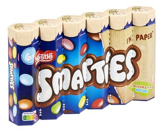 Ingrédients : sucre, LAIT écrémé en poudre, pâte de cacao, beurre de cacao, farine de BLÉ, matière grasse de LAIT anhydre, PETITLAIT en poudre, amidon de riz, émulsifiant (lécithines), colorants (rouge de betterave, caroténoïdes, curcumine), concentré de spiruline, agents d'enrobage (cire de carnauba, cire blanche d'abeilles), concentrés de plantes (carthame, radis), extrait de malt d'ORGE.