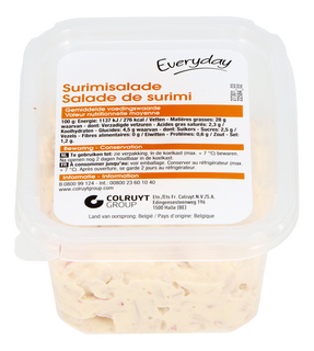 48,5 % surimi [POISSON, eau, blancs d’OEUFS, amidons (pommes de terre,BLÉ (gluten), maïs, pois), huile de navette, protéines de SOJA, sucre, sel,arôme (CRUSTACÉS, POISSON, SOJA), amidon modifié, exhausteurs degoût (E621, E635), stabilisant (E407), colorants (E120, E160c)], huile decolza, eau, jaune d’oeufs (jaunes d’OEUFS, sel), vinaigre, sucre, amidonmodifié, MOUTARDE, arôme (CRUSTACÉS, POISSON, LAIT, SOJA), sel,stabilisants (E412, E415), extrait d’épice, acidifiants (E330, E334), correcteurd’acidité (E262), conservateurs (E202, E211), colorants (E160a, E120),antioxydant (E385).