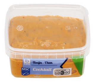 Ingrédients: 44 % thon (POISSON), 39,4 % saucecocktail [huile de colza, eau, jaunes d’OEUFS, vinaigre, 2,7 % concentréde tomates, 0,9 % tomates en poudre, sucre, dextrose, amidon modifié,sel, arôme (CÉLERI), vin, MOUTARDE, oignons, ail, épaississants (E412,E415), acidifiants (E270, E330, E334), correcteur d’acidité (E262),conservateurs (E202, E211)], 10,5 % carottes, OEUFS, plantesaromatiques et épices, persil, fibres d’agrumes, huile de tournesol, extraitde légumes, colorant (E160c).
