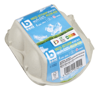 Label: eco-score: B. Classe A. Large (≥ 63 - < 73 g). Explication du cachet sur l'oeuf: Le cachet débute par un chiffre indiquant le type d’élevage: 0 pour les oeufs biologiques, 1 pour les poules élevées en plein air, 2 pour celles élevées au sol et 3 pour celles élevées en batteries. Suivent le pays d’origine (BE), le numéro du producteur (4 chiffres), et éventuellement le numéro de pondoir (1 ou 2 chiffres).