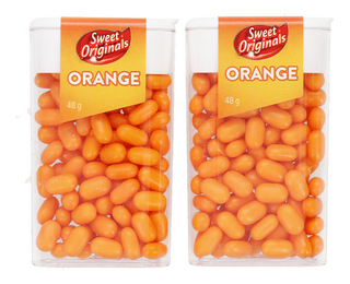 Ingrédients: sucre, sirop de glucose, épaississant: gomme arabique, correcteur d'acidité: acide citrique, amidon de riz, arôme: orange, antiagglomérant: E470b, colorants: E100 et E120, agent d'enrobage: cire de carnauba.