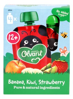 33% banane, 28,5% pomme, 20% fraise, 17% kiwi, 1,5% carotte violette, acide L-ascorbique, jus de citron concentré.