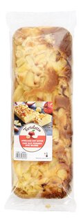 INGRÉDIENTS: pomme 30 %, OEUF, sucre, farine de BLÉ, BEURRE 8.5 %, huile de colza, amidon de BLÉ, sirop de glucose (séché), sirop de glucose, amidon modifié, émulsifiants: E471, E322, E493, poudres à lever: E450, E500, conservateur: E202, acidifiant: E330, sel, affermissant: E509, antioxydant: E300, épaississants: E415, E414, arôme, colorant: E160b, gélifiant: E440, agent de traitement de la farine: E300, enzyme (GLUTEN). Peut contenir des traces de SOJA et de FRUITS À COQUE.