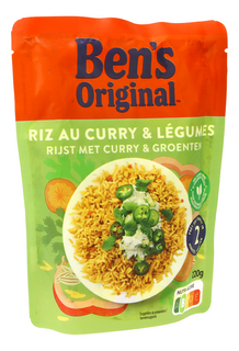 Ingrédients: riz long grain étuvé à la vapeur (81%), carotte (5.9%), poivron rouge (5.6%), huile de tournesol, épinards (réhydratés), oignons en poudre, sel, coriandre, épices, extrait de levure, grains de cumin, ail en poudre, acidifiant (acide citrique), curry en poudre.