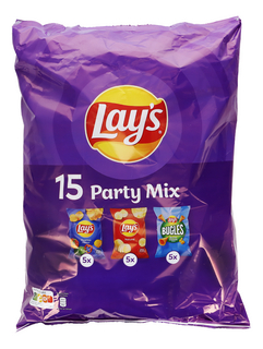 Ingrédients: Chips de pommes de terre goût paprika 27,5 gr - Ingrédients: pommes de terre, huiles végétales (tournesol, colza, maïs, en proportion variable), base aromatisante au goût paprika [sucre, sel, poudre de paprika, poudre d'oignon, poudre d'ail, arômes, poudre de paprika doux fumé, fructose, colorant (extrait de paprika), piment de Cayenne, acidifiants (acide citrique)]. Chips de pommes de terre salés 27,5 gr - Ingrédients: pommes de terre, huiles végétales (tournesol, colza, maïs, en proportion variable), sel. Produits à base de maïs, goût fromage 27,5 gr - Ingrédients: maïs, huile de tournesol, base aromatisante au goût fromage [perméat de petit-lait (LAIT), petit-lait en poudre (LAIT), arôme naturel (poivre noir, romarin, curcuma, crème et fromage (LAIT), oignon en poudre, tomate en poudre, FROMAGE en poudre, ail en poudre, correcteurs d’acidité (acide citrique, acide lactique), colorant (extrait de paprika)], sel, sucre. Peut contenir du soja et du blé (gluten).