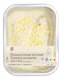 Ingrédients: 38 % chicon, 7 % jambon fumé [viande de porc, sel, protéines de porc, sirop de glucose, stabilisants (E451, E452), LAIT en poudre, arôme naturel (BLÉ (gluten)), antioxydant (E301), conservateur (E250)], LAIT demi-écrémé stérilisé, roux [farine de BLÉ (gluten), graisse de palme partiellement hydrogénée], mélange d'épices (CÉLERI, MOUTARDE, SOJA), 12 % fromage [LAIT pasteurisé, eau, huile de palme, amidon, sel, ferments lactiques, coagulant, protéines de LAIT, émulsifiant (E331), colorants (E160a, E160b(i)], conservateurs [E202, E262 (SOJA)].