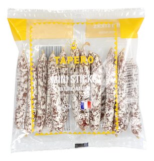 Porc (origine : France), sel, lactose (lait), dextrose, sucre, épices et arômes végétaux, conservateurs (E252, E250), ferments. Enveloppe de collagène (comestible). 187g de porc utilisé pour 100g de produit fini. Traces de fruits à coque.
