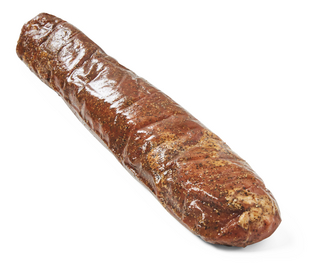 Ingrédients: 83 % viande de porc, eau, 3,3 % mélange aromatique[épices et extraits d’épice (1,4 % poivre noir), conservateur (E262, antioxydant (E301), colorant (E150a), eau, siropde glucose], sel, antioxydants (E331, E301), sirop de glucose, dextrose, protéines de LAIT, conservateur (E262),lactose (LAIT), protéine de porc, épaississant (E415).