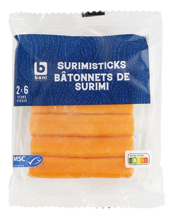 Ingrédients: 45 % surimi [chair de POISSON (colin d’Alaska et/ou merlu du Pacifique), stabilisants (E420, E450, E451, E452), sucre], eau, amidons [pomme de terre, BLÉ (gluten), maïs, pois], blanc d'ŒUF en poudre réhydraté, huile de navette, arôme (CRUSTACÉS), sel, sucre, protéines de SOJA, chlorure de potassium, exhausteur de goût (E635), colorant (E160c).