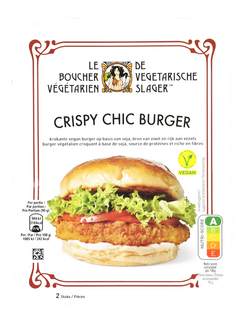 Burger végétalien croquant à base de soja ayant le goût et la texture du poulet, source de vitamine B12 et de fer.
