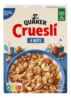 Ingrédients: flocons d'AVOINE complets (33%), BLÉ complet (19%), sirop de glucose, huile de tournesol, sucre, AMANDES grillées (4,2%), NOISETTES (4,0%), NOIX DE PÉCAN (1,5%), farine de riz (1,5%), farine de BLÉ (1,4%), oligofructose, NOIX DU BRÉSIL (1,0%), miel (0,5%), arôme naturel (BLÉ). Pourcentage total de noix 10,7%. Peut contenir du lait et différents types de fruits à coque.