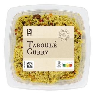 Ingrédients: Eau, 24 % semoule de BLÉ (gluten), huiles végétales (colza, coton, tournesol), 17 % poivron, 4,8 % raisin sec, oignon, 3,6 % ananas [ananas, sucre, acidifiant (E330), conservateur (E223)], tomate, carotte, 1 % pâte de curry [eau, 13 % curry, huile de navette, sucre, sel, plantes aromatiques et épices, amidon modifié, oignon, conservateurs (E270, E202), extrait de levure, ail, arôme, colorant (E160c), épaississant (E412)], coriandre, sel, vinaigre, sirop de sucre inverti, persil, menthe, cumin, concentré de carthame, sirop de glucose, conservateurs (E262, E202, E270), correcteur d'acidité (E325), antioxydants (E300, E301, E330). Peut contenir des traces de crustacés, d'œufs, de poisson, de soja, de lait, de céleri, de moutarde, de sésame et de mollusques.