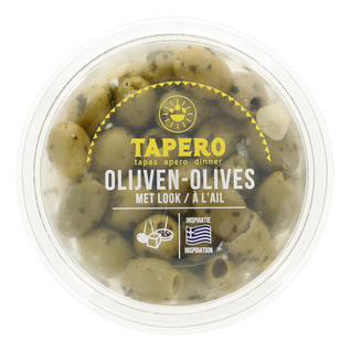 Ingrédients: 85% olives vertes dénoyautées (olive, sel, acidifiants: acide lactique, acide citrique), 9% gousses d'ail (ail, sel, correcteur d'acidité: acide lactique), 3.3% flocons d'ail, (ail, vinaigre), huile de colza, conservateur: sorbate de potassium; basilic. Malgré des contrôles consciencieux ce produit peut contenir des noyaux