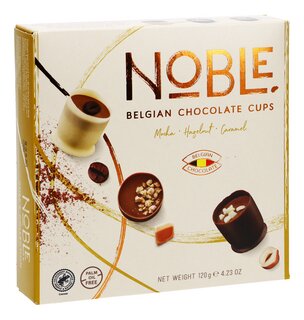 Coupes de chocolat fourrées. Ingrédients : sucre, beurre de cacao, pâte de cacao, matière grasse LAITière, poudre de LAIT entier, NOISETTES 9%, huiles végétales (karité, noix de coco, tournesol), lactosérum LAITier, émulsifiant : lécithines (SOY), café 0,1%, poudre de LAIT écrémé, sucre LAITier, agent d'enrobage : (gomme laque, gomme arabique), arômes naturels, sel.Peut contenir des traces d'autres noix, de gluten et d'œuf.Chocolat au lait : extrait sec de cacao : 32% minimum, extrait sec de lait : 21% minimum. Chocolat noir : extrait sec de cacao : 52% minimum. Chocolat blanc : extrait sec de cacao : 28% minimum, extrait sec de lait : 22% minimum.