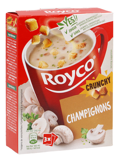 Ingrédients: sirop de glucose, amidon de pomme de terre, huile de palme, CROUTONS 12% (farine de BLE (GLUTEN), huile de palme, sel, levure, antioxydant: extrait de romarin), maltodextrine, sel, extrait de champignon 6,0%, arômes (contient ORGE (GLUTEN)), morceaux de champignon 1,5%, protéine de LAIT, extrait de levure, oignon, épaississant: gomme de xanthane, stabilisant: E451, persil 0,2%, épice, extrait de malt d'ORGE (GLUTEN), CELERI. Contient 2,0% de légumes.