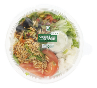 Ingrédients: 20 % pâtes alimentaires préparées [eau, semoule de BLÉ dur (gluten), huile de colza, thym, sel, paprika, poivre blanc], tomate, 17 % sauce tzatziki [eau, fromage blanc (LAIT), huile de colza, concombre, yaourt en poudre (LAIT), jaune d'ŒUF, vinaigre, sucre, moutarde (eau, graine de MOUTARDE, vinaigre, sel), sel, ail en poudre, extrait de poivre, amidon, LAIT écrémé en poudre, poivre blanc, stabilisant (E415), acidifiant (E270), correcteur d'acidité (E327)], mélange de laitue, poivron (jaune, rouge, vert), 10 % feta AOP [LAIT de brebis, LAIT de chèvre, sel, ferments lactiques, coagulant microbien, correcteur d'acidité (E509)], concombre, olive noire [olive, sel, acidifiant (E270), stabilisant (E579)], oignon rouge, huile de colza, origan. Peut contenir des traces de gluten (avoine), de crustacés, de poisson, d'arachides, de soja, de fruits à coque (amandes, noix, noix de cajou, noix de pécan et pistaches), de céleri, de sésame et de mollusques.